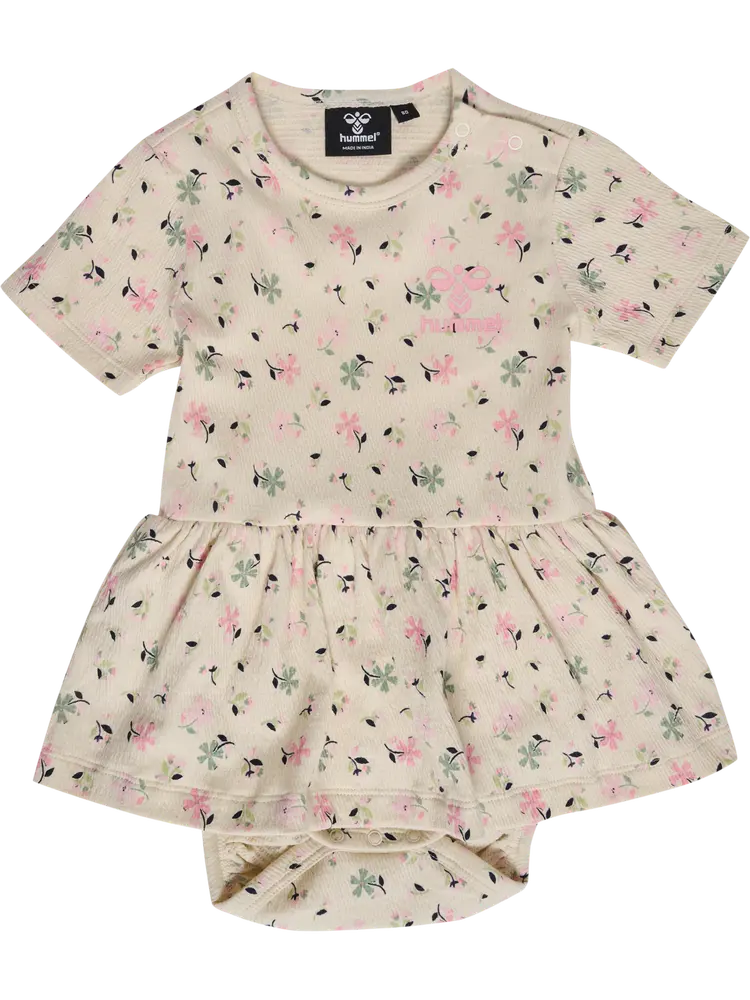 TYRA BODY DRESS S/S er lavet af blødt, strikket jerseystof og kombinerer den klassiske bodystocking-funktionalitet med et sødt kjolelook. Bodykjolen har et dekorativt all-over print og et trykt hummel bi-logo på brystet. Knapper i bunden og på skulderen g