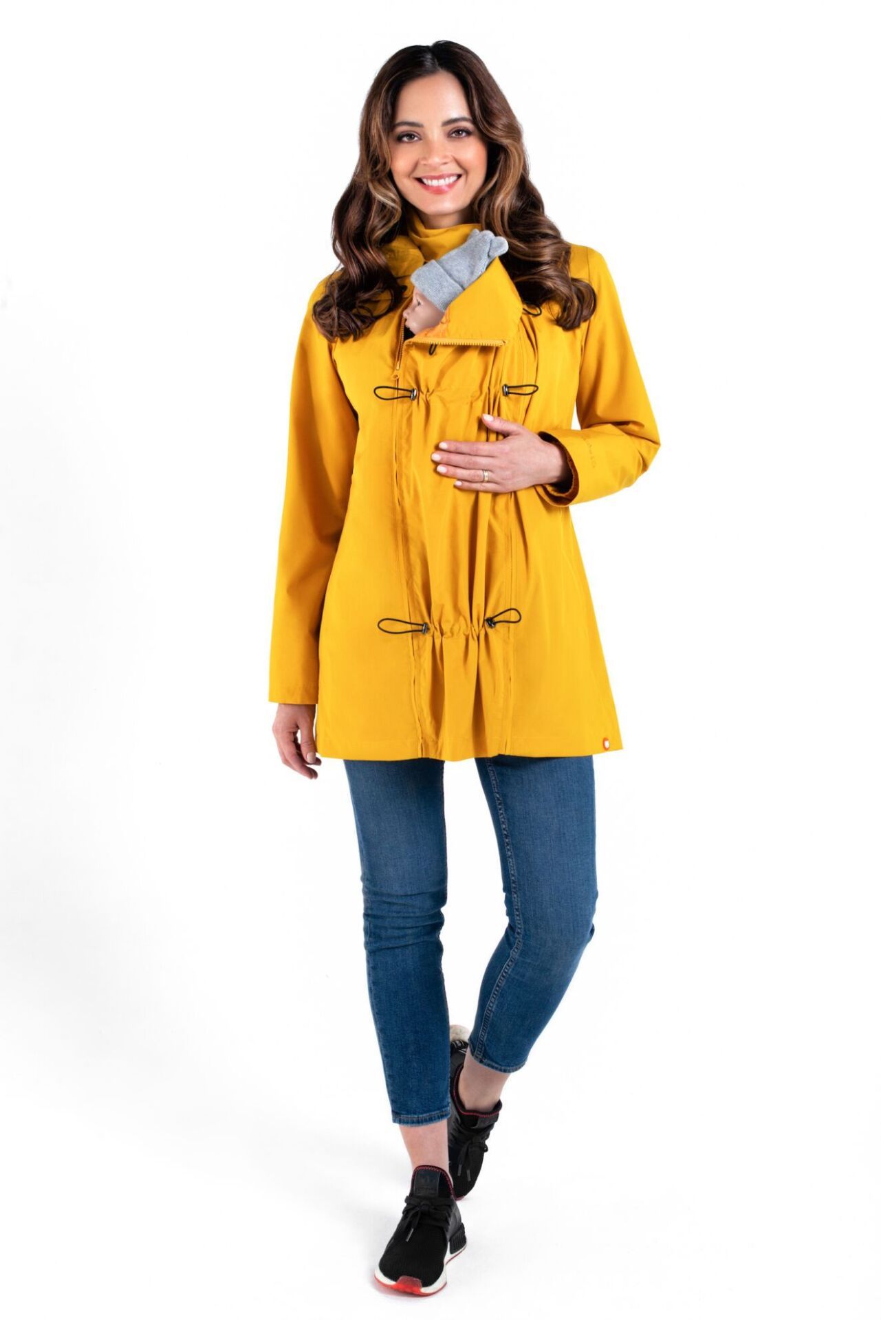 Jakken har 4 forskellige anvendelses muligheder: Graviditet, Front babybæring, ryg babybærin eller normalt brug